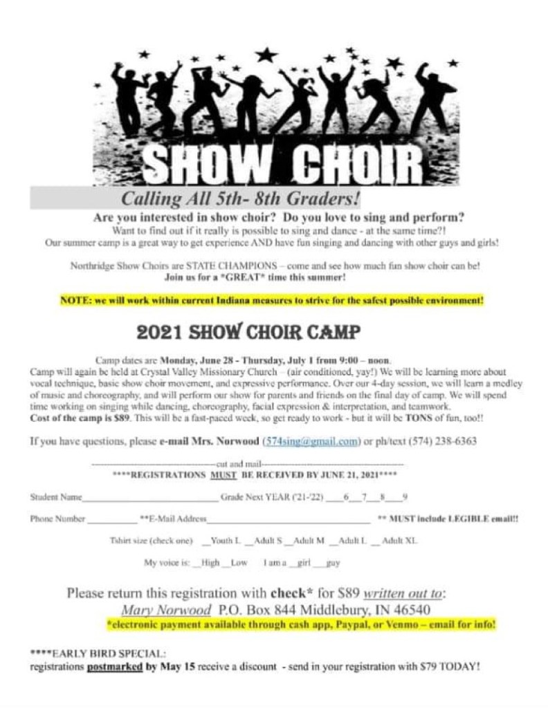 June 4, 2021armingtonj Leave a comment June 21st is the deadline for show choir camp! It will be so much fun this year! Don’t miss out! Share this: Click to share on X (Opens in new window) X Click to share on Facebook (Opens in new window) Facebook Like Loading...